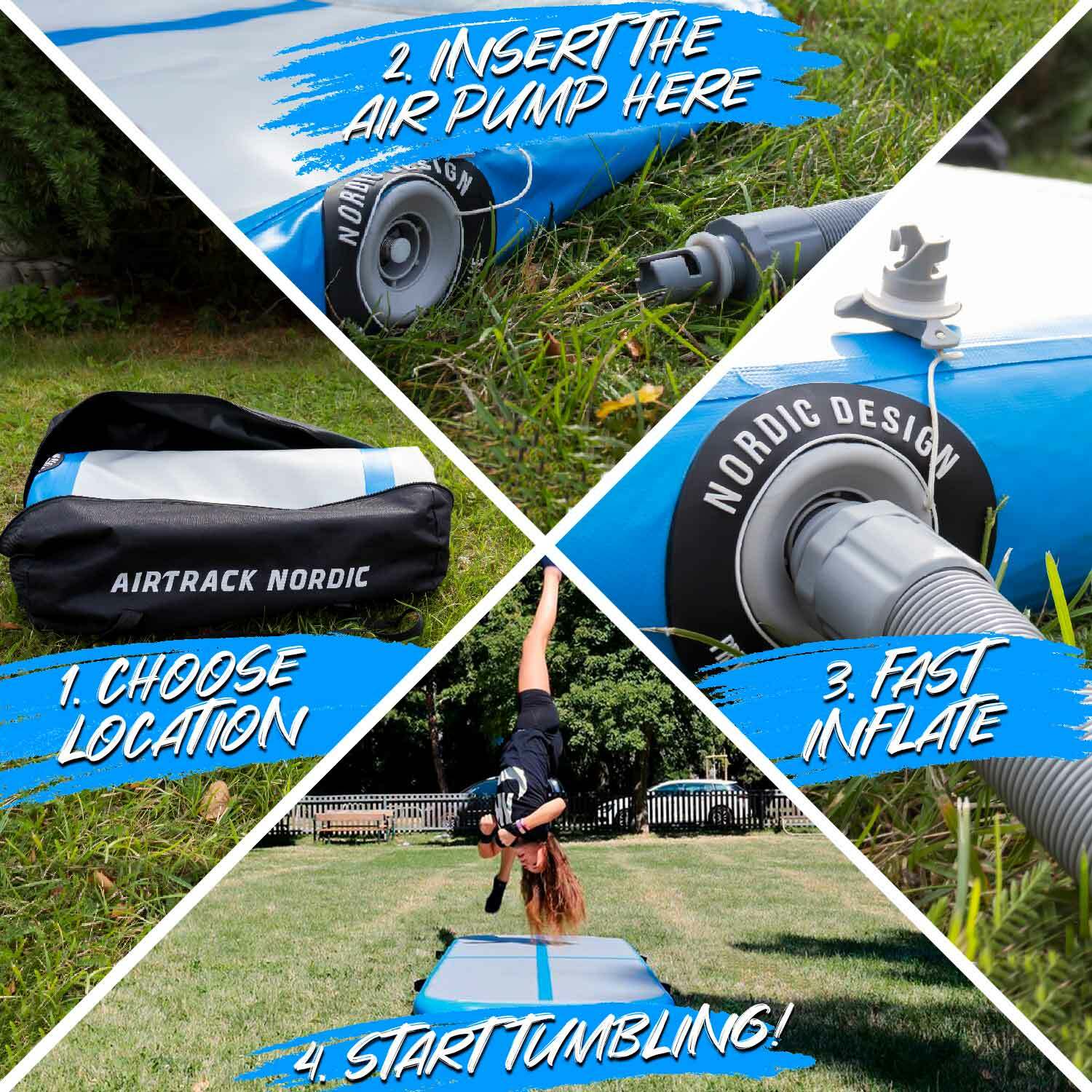 The AirTrack is easy to fill and empty with the included electric pump. It takes just 30 seconds to fill the AirTrack! The pump also allows you to adjust the air pressure/resilience of the mattress to your liking. The AirTrack is also easy to fold and roll up and can be stored in the included carrying bag.